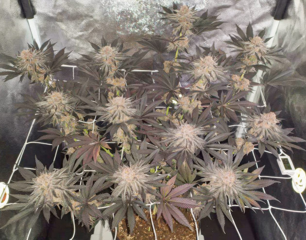 Харвест! Могу без преувеличения сказать, что это одна из лучших генетик, которую я выращивал. С точки зрения культивации Biscotti Mintz – это абсолютно нетребовательный гибрид, спокойно переносящий тренировки и отлично растущий на органике. У цветущих растений сильный запах, учитывайте это, иначе все помещение будет вонять шишками. И аромат этот ни с чем не спутаешь. Внешний вид: вы сами всё видели, это какой-то черный монстр, а не куст конопли. Такого оттенка я точно не ожидал.