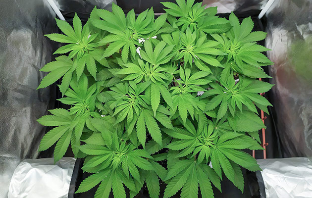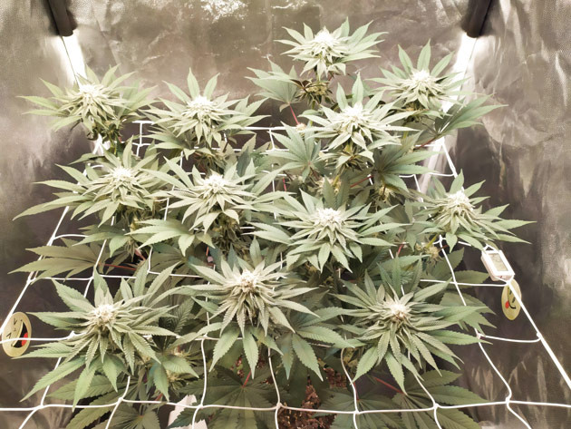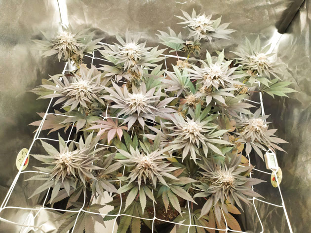 На шестой неделе натянул сетку ScrOG и установил световой режим на 12/12. Растиха отреагировала очень быстро, уже за первую неделю предцвета прибавила добрые 10 сантиметров роста. Если куст сильно вытянется, то это может стать проблемой, так как при высоте бокса в 160 сантиметров 80 из них уходят на горшок, освещение и вентиляцию. Что касается ухода за растением, то я продолжил удалять листву и начал активно разводить подросшие веточки по ячейкам сетки. Также начал обрезать некоторые паростки на нижних ярусах, чтобы они не отнимали энергию у макушек. Полив не увеличивал, лью 1,5 литра за раз. Один раз добавил мелассы, чтобы бактерии в почве начали работать активней.