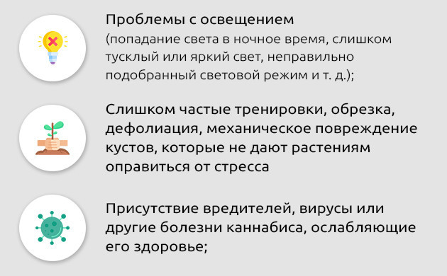 • присутствие вредителей, вирусы или другие болезни каннабиса, ослабляющие его здоровье;
