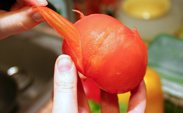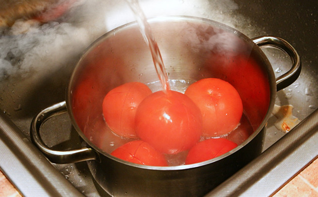 Помидоры нужно помыть и очистить от кожицы, что очень просто сделать, обдав их кипятком и подержав в горячей воде пару минут. Затем очищенные томаты нужно измельчить в блендере, на терке либо протереть через сито.