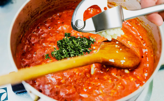 Томатному соусу нужно дать повариться еще 5 минут, после чего добавить измельченные чеснок и травы, чуть-чуть потомить и можно снимать с огня.