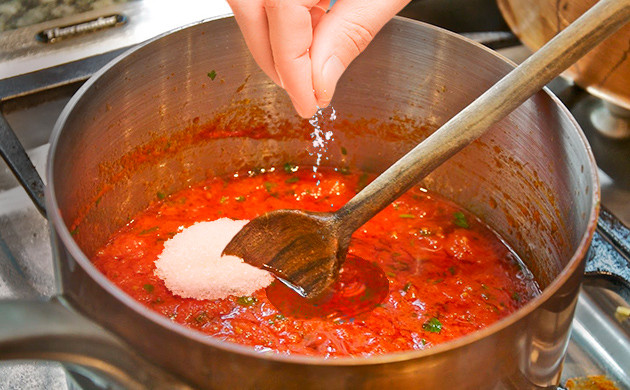 Полученная томатная масса варится на медленном огне в течение 5 минут при постоянном помешивании, после чего в нее добавляются соль, сахар, масло, и все тщательно перемешивается.