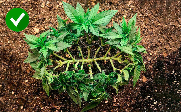 Наиболее популярные и легко применимые методы – LST (низкострессовая тренировка, подгибание основного стебля и боковых ветвей) и ScrOG. Метод ScrOG (Screen Of Green – “экран зелени”) заключается в том, что побеги каннабиса заправляются под заранее установленную сетку, и за счет этого создается плоская поверхность кроны (тот самый "экран зелени"), над которой возвышаются только соцветия. Таким образом, каждое из них получает достаточно света, а опознать коноплю в таком распластанном по сетке растении сможет разве что знаток.