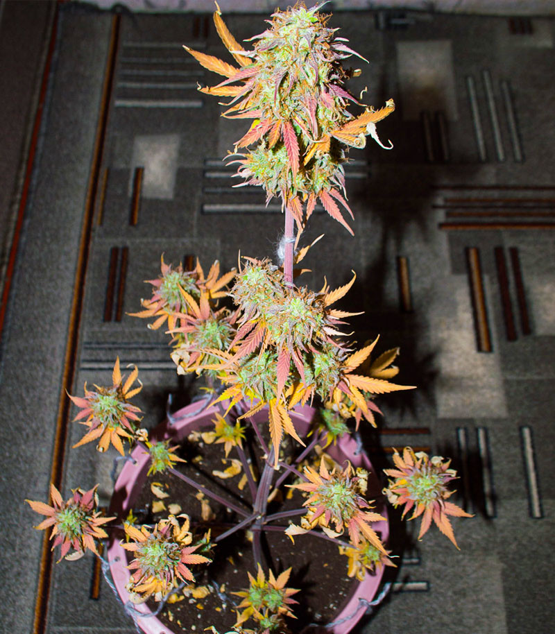 Структура кустов автоцвета напоминает новогоднюю елку. Они формируют большую центральную колу, которая в процессе цветения превращается в одну сплошную, плотную шишку, покрытую толстым слоем смолы. Чтобы повысить урожайность можно применить техники повышения производительности ScrOG и LST-подгиб. Также стоит отметить способность сорта стойко переносить перепады температур и высокие показатели влажности.