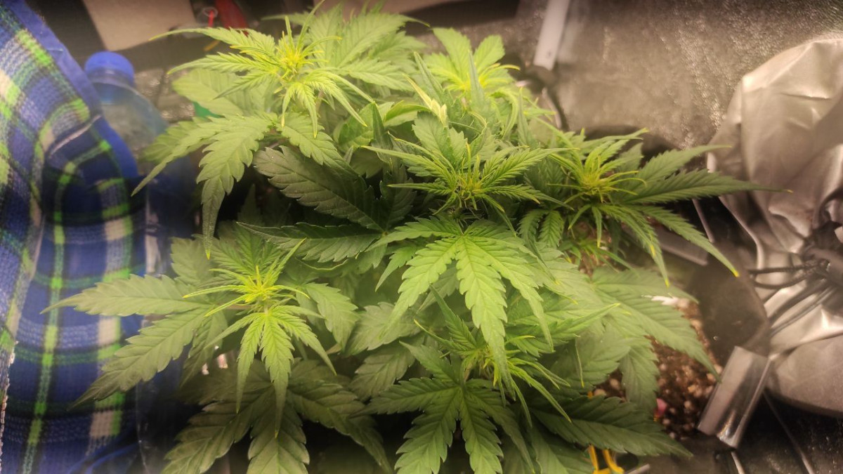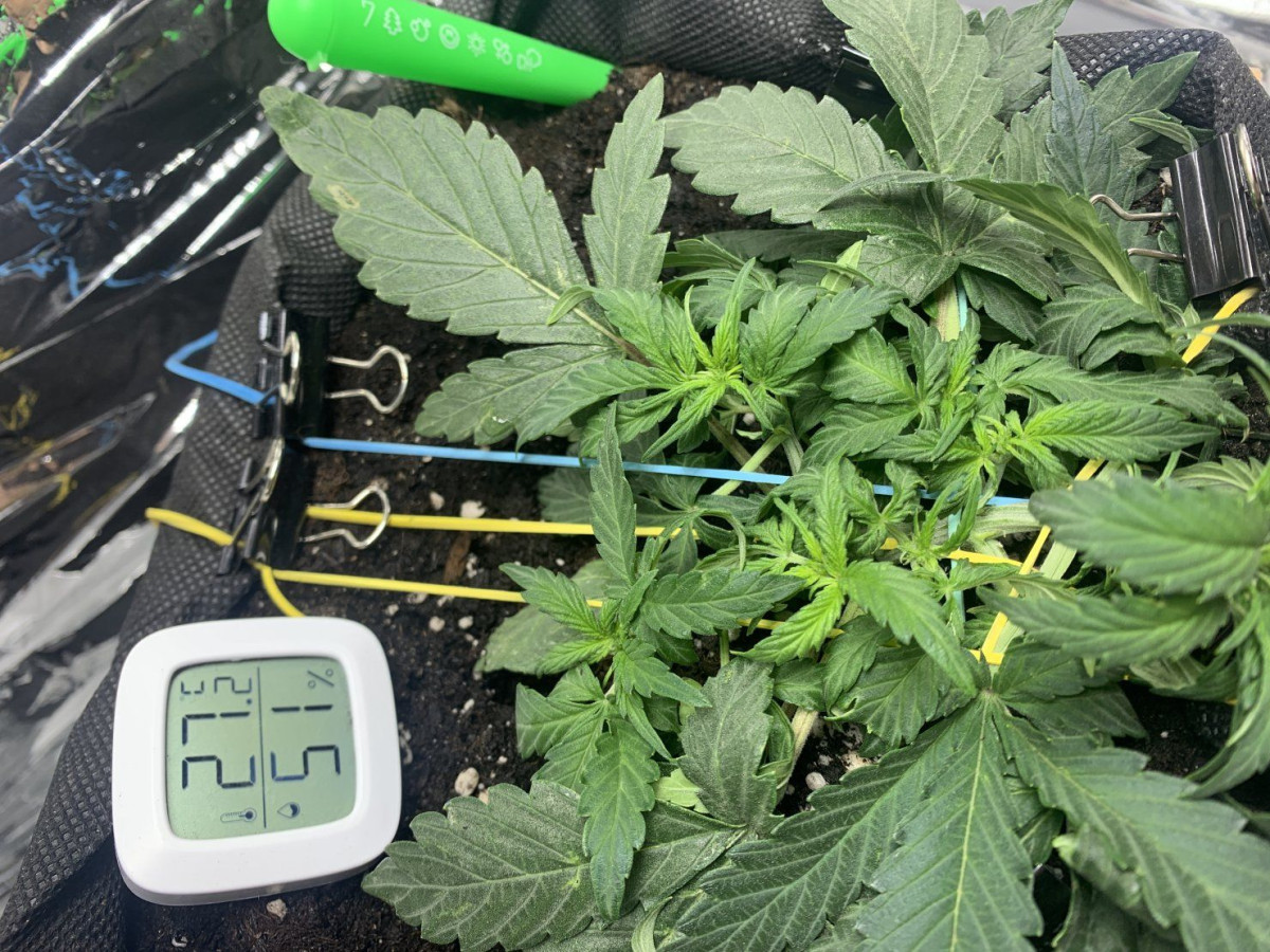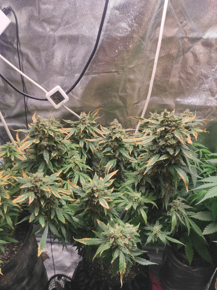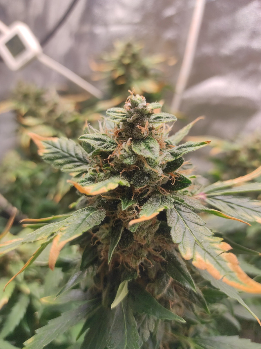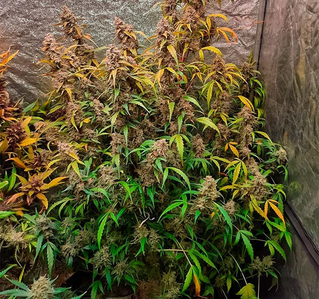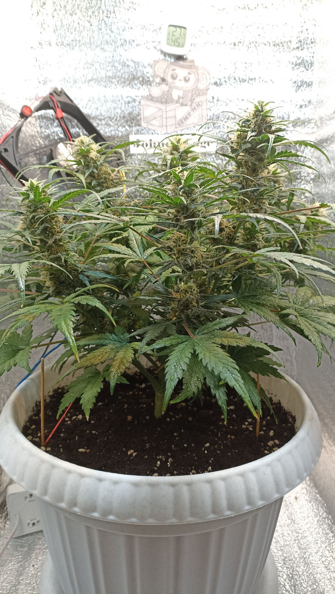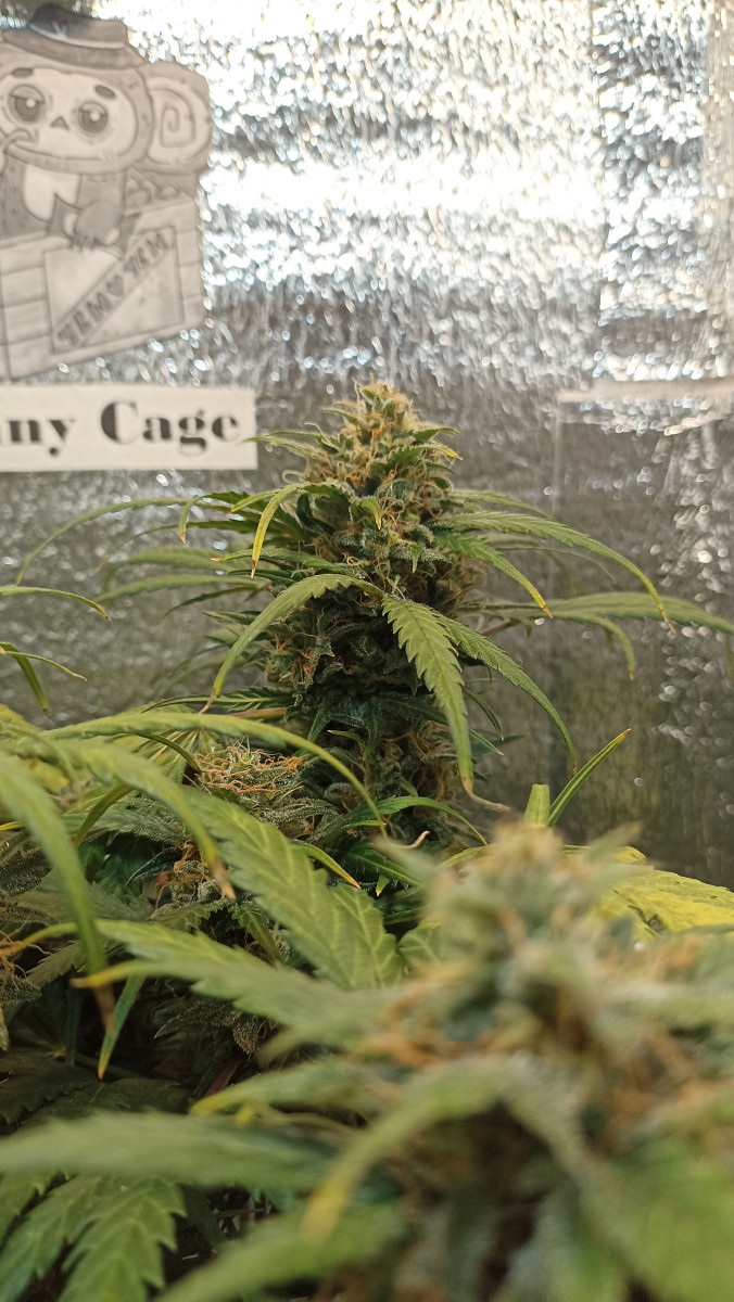 - Общие впечатленияЭто был эксперимент – гров с минимальными вложениями, и так получилось, что под мою «горячую руку» попался Johnny Cage Auto от Семяныча. И растишка выдержала этот удар. Только в начале вегетации очень нехотя развивалась вверх, в основном была приземистой и росла вширь. На 16-й день кустик был всего 14 см в высоту, но уже показал пол, девочка, конечно же. Однако причина низкого роста крылась в слишком высокой температуре, ведь в моем боксе и до 31 доходило часто. Увеличил влажность, дал доп обдув, температура упала, и уже спустя несколько дней растишка выглядела лучше и крупнее. Удобрения усваивало растение хорошо. В 5 недель вовсю зацвело, но меня смутили фиолетовые черешки. И я стал усиленно кормить девочку, устроив ей в 6 недель перекорм и стресс. Проблему помог решить пролив чистой водой. Помогло, но затем появились признаки дефицита по ряду элементов. Подкормил, снова перекормил, снова пролил. И так мы протянули до 60 дней от каски и до харвеста.
