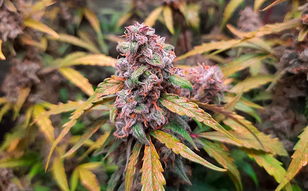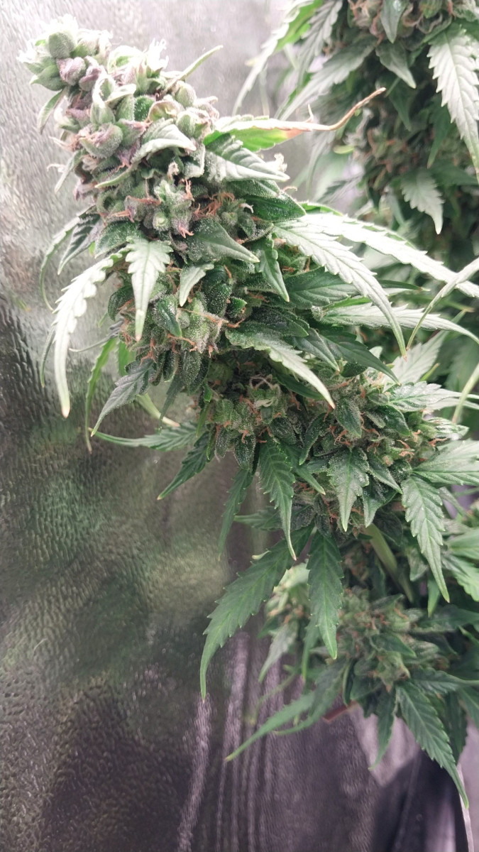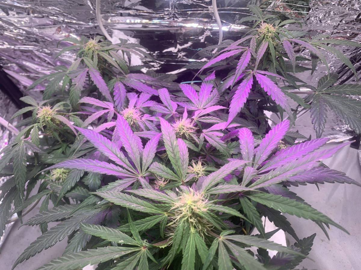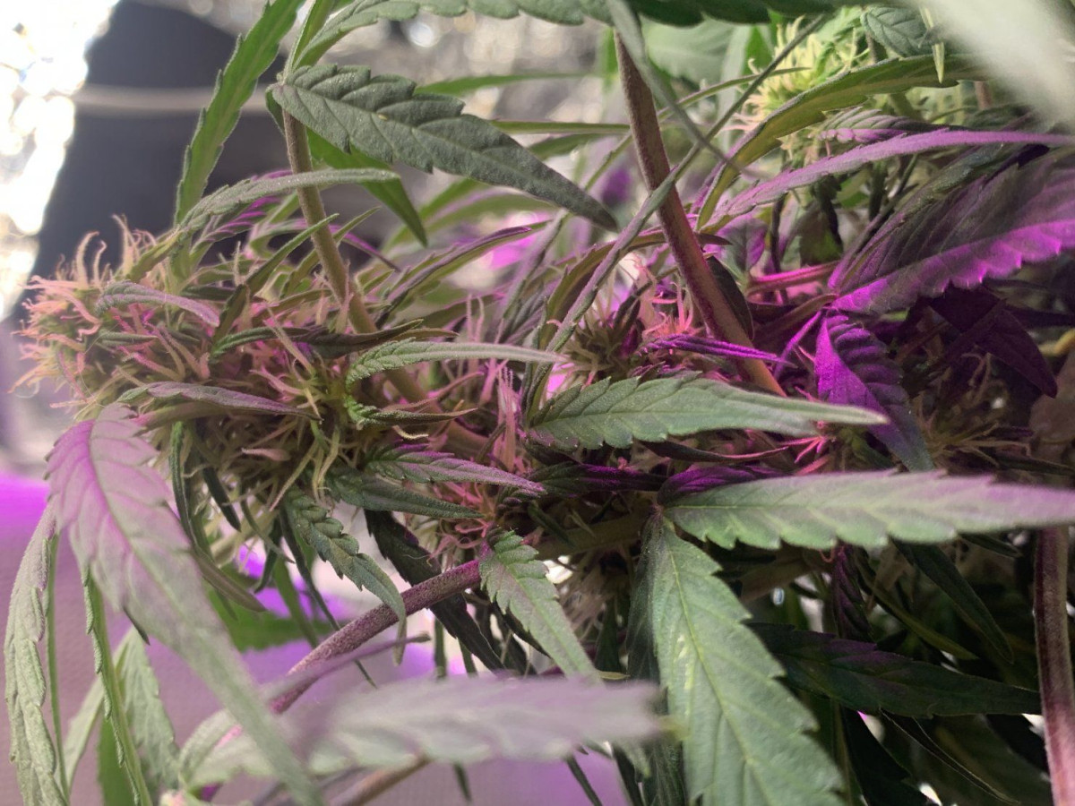 8 недель от семки – это как раз примерно половина цветения, судя по шишкам. Очень быстро не только развивается, но и цветет. В 10 недель появились удивительные фиолетовые оттенки и начал очень сильно пахнуть.
