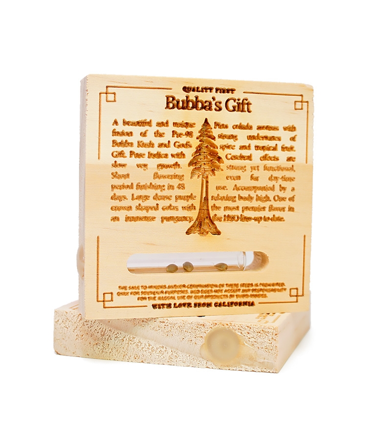 В 2008 году, бридеры Humboldt Seeds случайно обнаружили это чудо, после того как «папка» pre-98 Bubba Kush тайком пробрался в комнату полную женских растений God’s Gift. Опробовав появившееся растение в деле, бридера сразу поняли, что это будущий сорт-победитель и несколько лет его выхаживали и оттачивали, пока Bubba’s Gift не превратился в образец изящества.