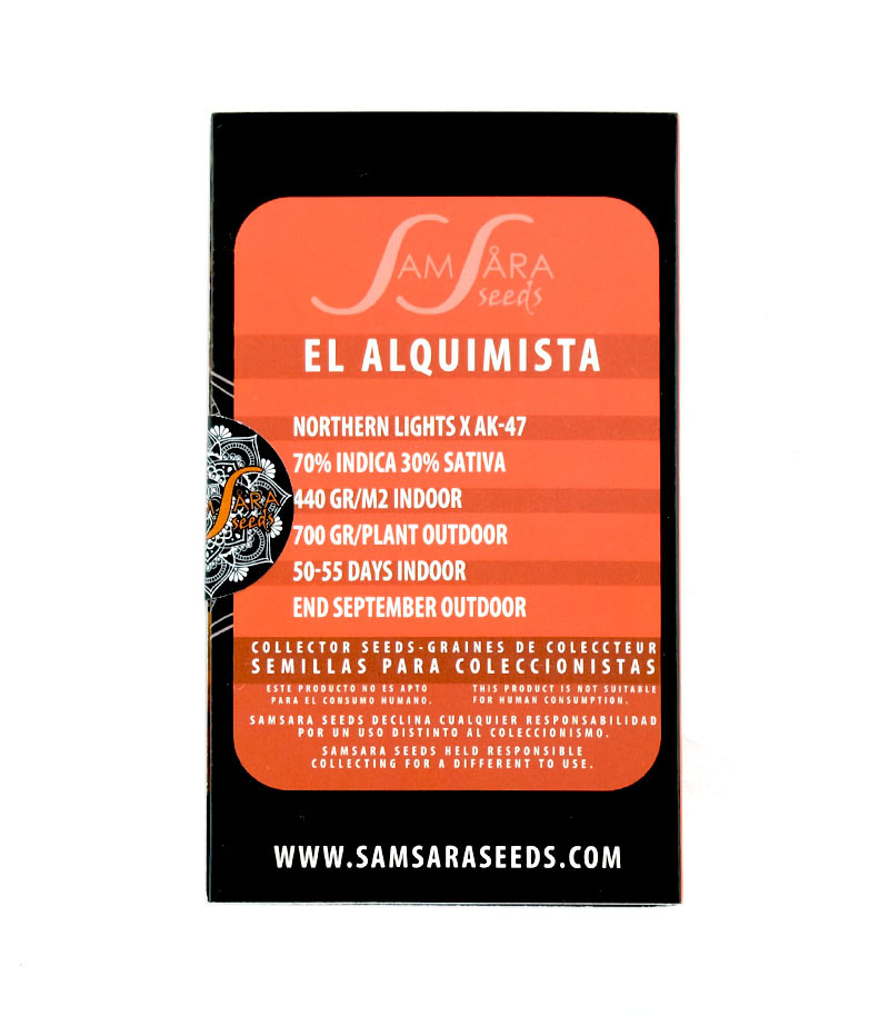 Семена конопли El Alquimista были получены селекционерами сидбанка Samsara Seeds в результате скрещивания одного из самых быстрых сатива-доминантных растений – AK47, с легендарным гибридом Northern Light, перевернувшим мир каннабиса вверх дном. Генетический код полученной растишки на 70% состоит из генов индики. Остальные 30% приходятся на сативу.