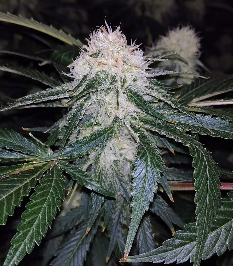 Объемные конусовидные шишки растения, будто слоем сахара, обильно покрываются трихомами и щедро выделяют смолу. С учетом выхода в 750-900 г с куста в условиях открытого грунта можно легко позволить себе отложить половину стаффа для экстрагирования, а потом месяцами наслаждаться ароматным густым дымом с самым широким терпеновым профилем.