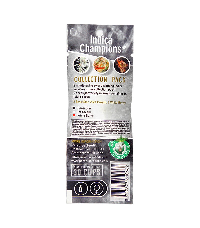 Микс семян конопли Indica Champions Pack – это первоклассная подборка индика-доминантных растений. В нее входят по две семечки сортов Sensi Star, Ice Cream и Whiteberry. Они прекрасно себя чувствуют в индоре и аутдоре. Период цветения растишек длится 50-60 дней, а рост кустов не превышает 130 см.