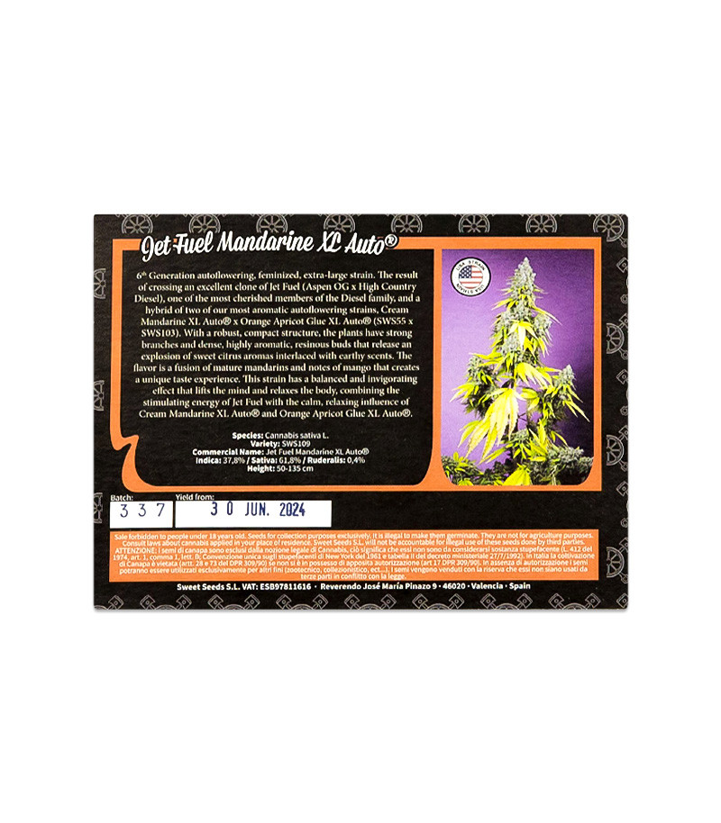 Семена сорта Jet Fuel Mandarine XL Auto fem (Sweet Seeds) Испания, Феминизированные, Автоцветущие, ТГК-18 - 26