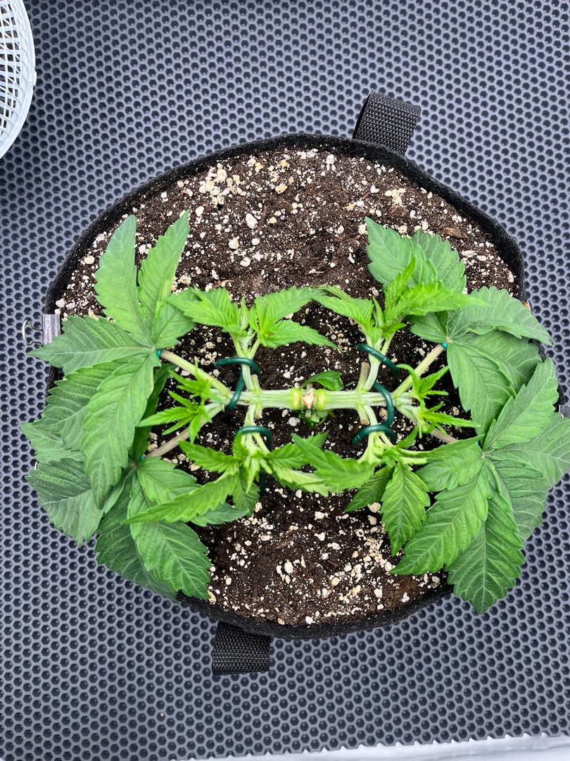 Вегетация до перевода на цветение длилась 5 полных недель. к этому моменту рост растишек достиг 40 см, только одна начала немного отставать, хоть и выглядела вполне здоровой и довольной. После перехода на цвет случился скачок роста, но только для одной девочки. Вторая была средняя, а третья плелась позади. Тем не мене, у всех была красивая структура и здоровая зеленая листва. Сделал дефолиацию, натянул сетку scrog на 5 неделе цветения.