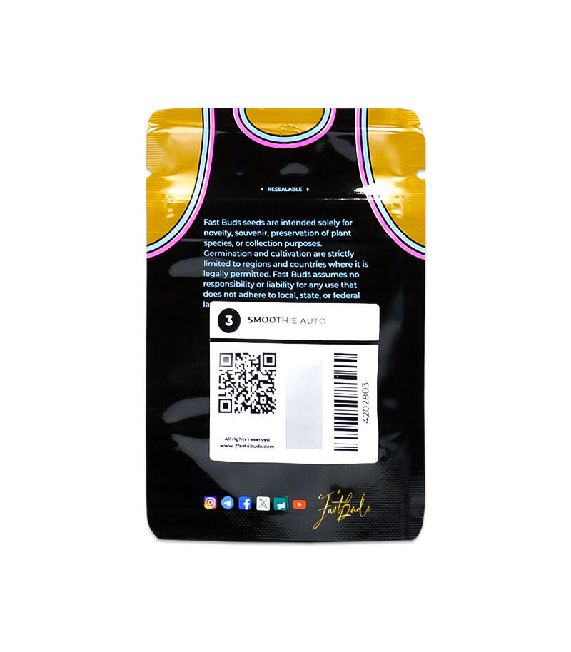 В ассортименте сидбанка Fast Buds множество превосходных сортов. Smoothie Auto – один из лучших среди всех автоцветов от этой американской компании. Гибрид был получен путём скрещивания Somango и Blueberry. Не обошлось без толики Рудералиса для придания растениям автоцветущих свойств. Сами Fast Buds заявляют, что это самый фруктовый сорт на современном канна-рынке автоцветов. Теперь у каждого гровера вне зависимости от опыта и навыков есть возможность убедиться в этом на собственном опыте, подняв кустик Smoothie Auto.